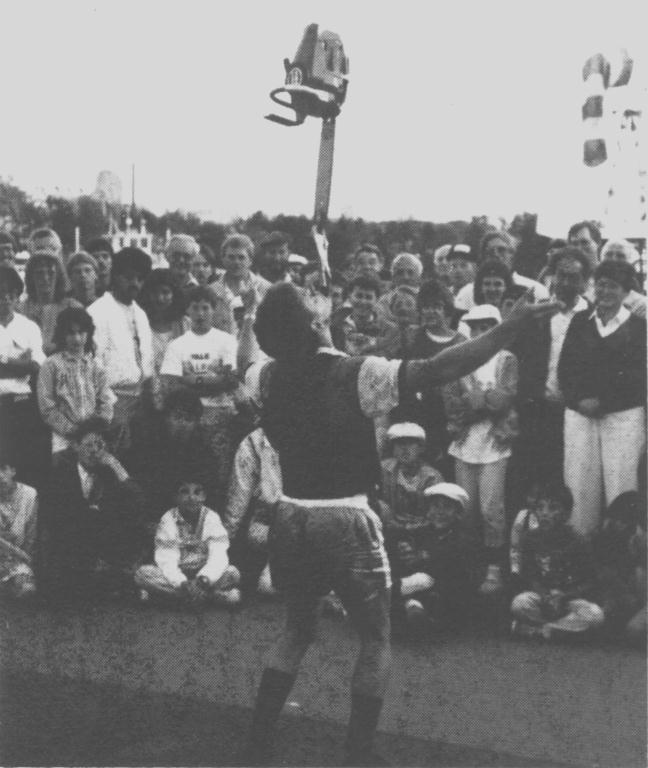 EXPO audiences were very attentive and happy to stay put for the average 30-minute show. Unfortunately, there seems to be a new generation of tourist who never knows just what they've seen until they get home to watch the video. A wishy-washy memo arrived from the EXPO brass asking the acts to put up with being video-taped. Several of the acts, having requested of a visitor that he put away the machinery and enjoy the show, simply packed up and abandoned the area. The worst abusers were the local TV camera jockeys who like to waltz into your circle and take over.
