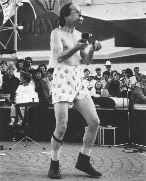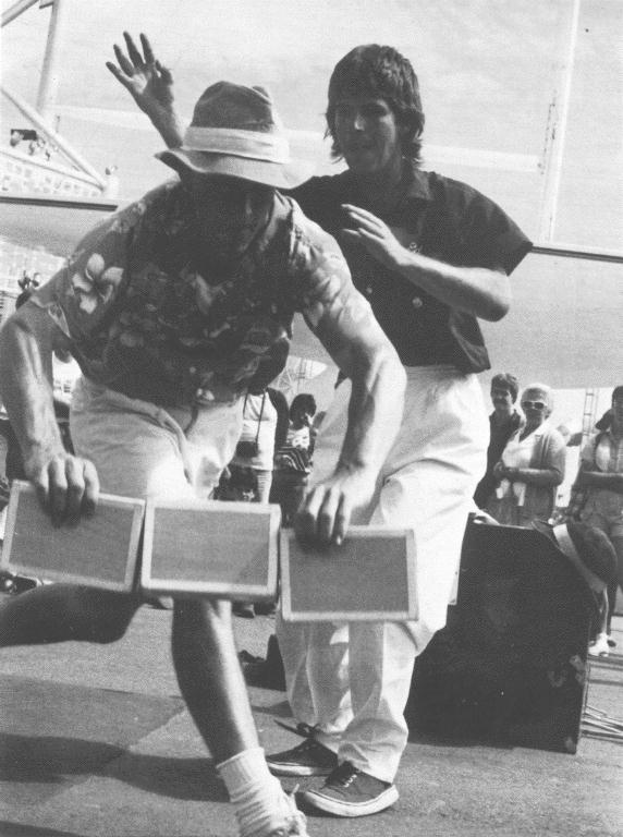 My partner, Fred Stinson, and I have one minor hang-up about traveling cross-country to gigs. It usually hits us at 35,000 feet that maybe this is all an elaborate practical joke. Maybe the jugglers back in Toronto simply made a few slick phone calls just to get us out of town for a while. After all, we'd heard that the Flying K's were going to be at EXPO. What the heck would they need Circus Shmirkus for? But when we were met at the airport by a nice lady holding a "Street Entertainers" sign and promptly loaded into a van with an all-female Polynesian toe-cymbal band I figured it was time to loosen up.