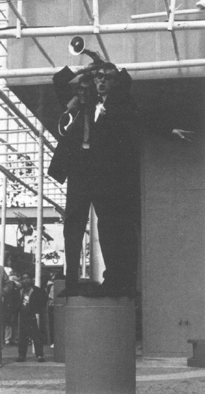 With some of the acts, such as Britain's 'Arry Pavarotti, the PL would tag along to ensure that he didn't get hauled away by security. 'Arry, a plump little character in a tuxedo and flight goggles, like to gather a crowd by climbing things that were clearly labelled "Stay Off!" Garbo, performing as "EXPO's smallest pavilion" inside his garbage can, was assigned a volunteer to keep people from stuffing him with trash and mostly to thwart the groups of young kids who thought it was a riot to try to tip him over.
