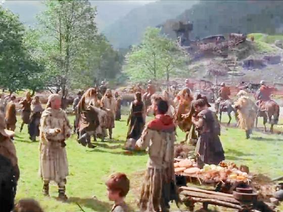 At 22:00, when Wallace is back in his village and the wedding is going on, two men are seen for 15 seconds at the left of the picture in a crowded field, juggling 3 knives each and passing 6 knives.