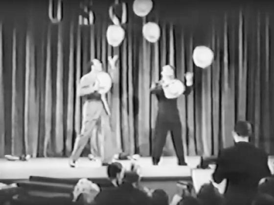 At 50:03, The Johnson Brothers, Duke Johnson and Harry Johnson, perform their juggling act for 2 minutes 20 seconds. They start with a comedy bit having each juggling 3 clubs. They then do run-arounds with 3 clubs and a hat. Then back to comedy with 3 hats each, followed by passing 6 hats. Then many variations with 5 hats. Finally, they then do some fast 6 club passing.