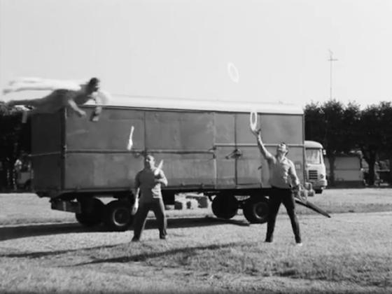At 16:45, the angel flies over 2 men one juggling 3 clubs and the other 2 rings in one hand and grabs one of the rings from the air.