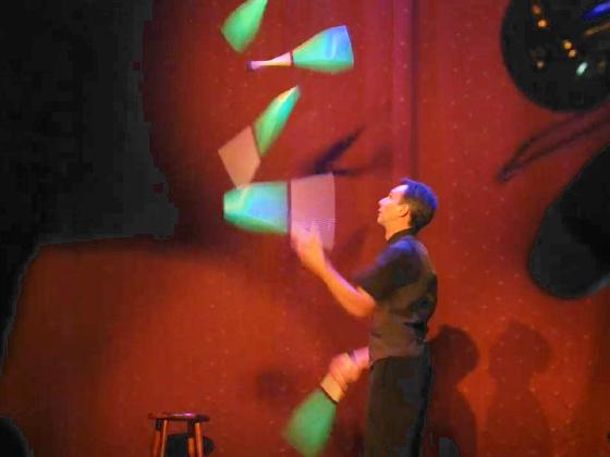 At 22:31, a male performer on stage juggles 5 clubs for 2 seconds.