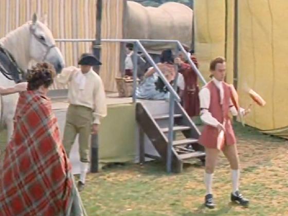 At 12:09, Michael Balfour plays John the Juggler, a circus performer seen juggling 3 clubs outdoors for 6 seconds.