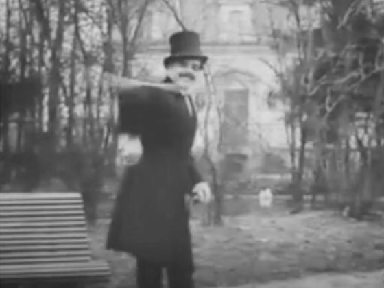 At 16:23, Max Linder does short tricks with his top hat and then his cane.