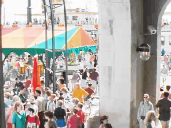 At 1:02:10, during a Mardi Gras celebration, a man in a black shirt and pants juggles 3 clubs for about 4 seconds, barely visible in the background.