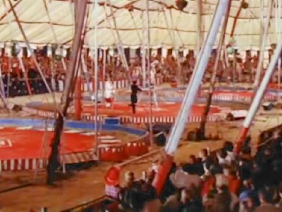 At 20:54, Johnny Joannides is seen in the distance in the center ring, dressed in black, and stands on one leg, spinning a ring on his other leg, and juggles 5 rings.