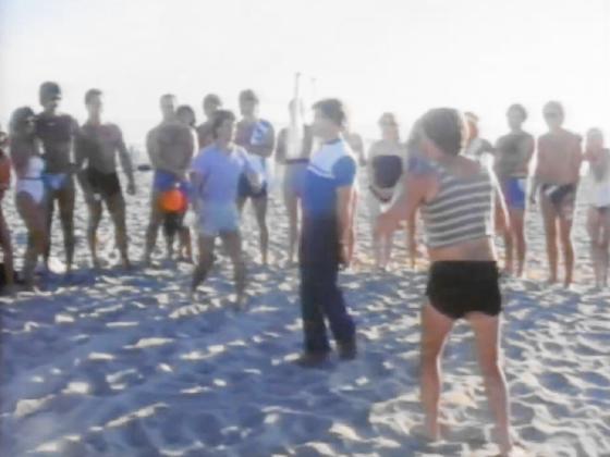 At 24:01, Peter Scolari and Eddie Deezen pass 6 clubs on the beach for 29 seconds. They start in a 4-count and then switch to a 2-count, with several different tricks, and then pass around someone.