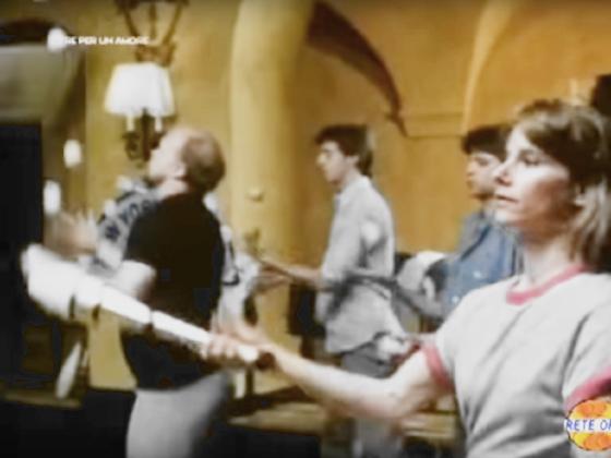 At 0:40:14, Burgess juggled 5 balls as he led a class with 4 students, including Stephen Collins and 2 other men who each juggled 3 balls, and a woman who juggled 3 clubs.