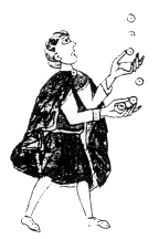 An old paper of mine, [6], discusses the tendency in illustrations to draw objects being juggled in a single arc over the jugglers head, while the juggler holds his arms far out to either side of his or her (usually his) body, and generally looks straight ahead instead of up at the pattern. This drawing is probably intended to represent a shower, though a correct representation of a shower would have the hands and arms much closer together, eyes directed toward the top of the pattern, and either far fewer objects, or an arc much taller relative to the width.
